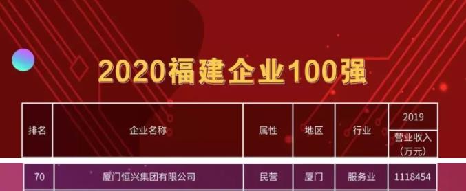 福建省企業(yè)與企業(yè)家聯(lián)合會(huì)聯(lián)合福建省社會(huì)科學(xué)院在大會(huì)上發(fā)布了“2020福建企業(yè)100強(qiáng)”榜單。廈門恒興集團(tuán)有限公司位列“2020福建企業(yè)100強(qiáng)”的第70位。