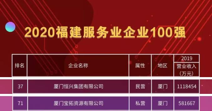 會(huì)上還發(fā)布了“2020福建制造業(yè)企業(yè)100強(qiáng)”“2020年福建服務(wù)業(yè)企業(yè)100強(qiáng)”“2020年福建戰(zhàn)略性新興業(yè)企業(yè)100強(qiáng)”3個(gè)子榜單。“2020年福建服務(wù)業(yè)企業(yè)100強(qiáng)”中,廈門恒興集團(tuán)有限公司位列第37位;廈門寶拓資源有限公司位列第71位。