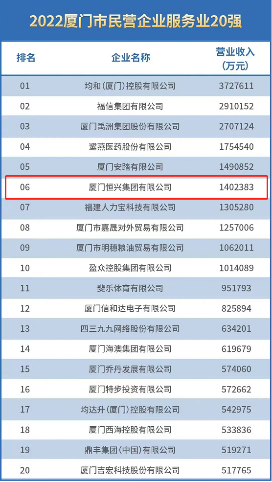 廈門恒興集團(tuán)有限公司入榜“2022年廈門市民營(yíng)企業(yè)百?gòu)?qiáng)”,位居榜單第10位;入榜“2022廈門市民營(yíng)企業(yè)服務(wù)業(yè)20強(qiáng)”,位居該榜第6位。??